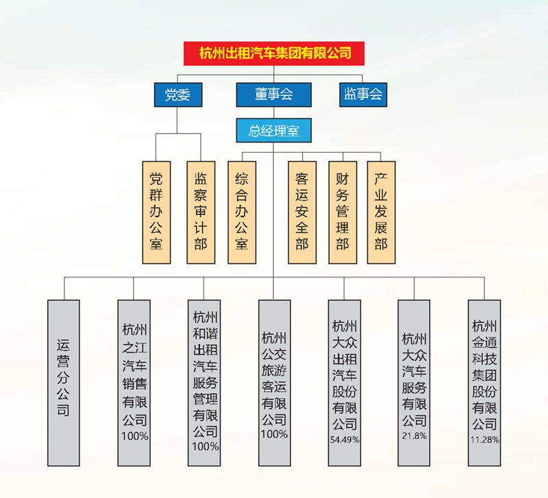 公司设6个管理部门,下辖运营分公司、之江销售、和谐服务、公交旅游等四家分(子)公司,控(参)股大众出租、大众服务。