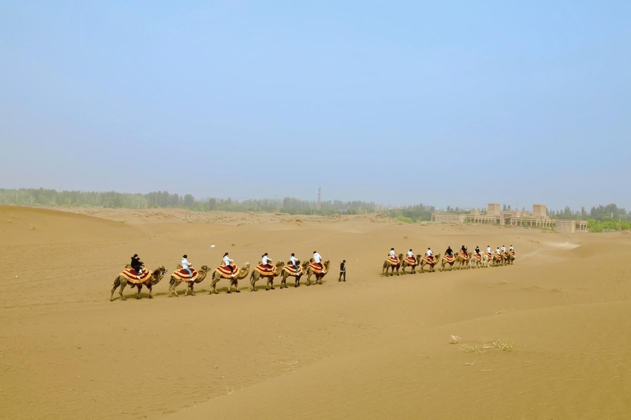 库木塔格沙漠。感受风沙漫天。行至最高处,优美逶迤的沙山就像是大海掀动的波澜,蜿蜒起伏;俯瞰足下,沙漠的沟沟壑壑、点点滴滴宛如大师挥洒自如的书面,千姿百态。在阳光照射下,远处的沙漠上空无一人,四周特别寂静,空气像凝固了一般,满眼都是黄彤彤的沙。